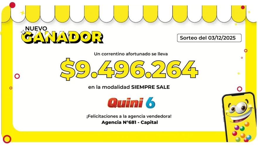 ¡El último mes del año arranca con premios millonarios en Corrientes! En el pasado sorteo de la modalidad Siempre Sale del Quini 6, un apostador de la localidad de Capital resultó ganador de $9.496.264, gracias a sus 5 aciertos. Los números favorecidos en esta ocasión fueron: 01 - 04 - 07 - 27 - 31 - 42.