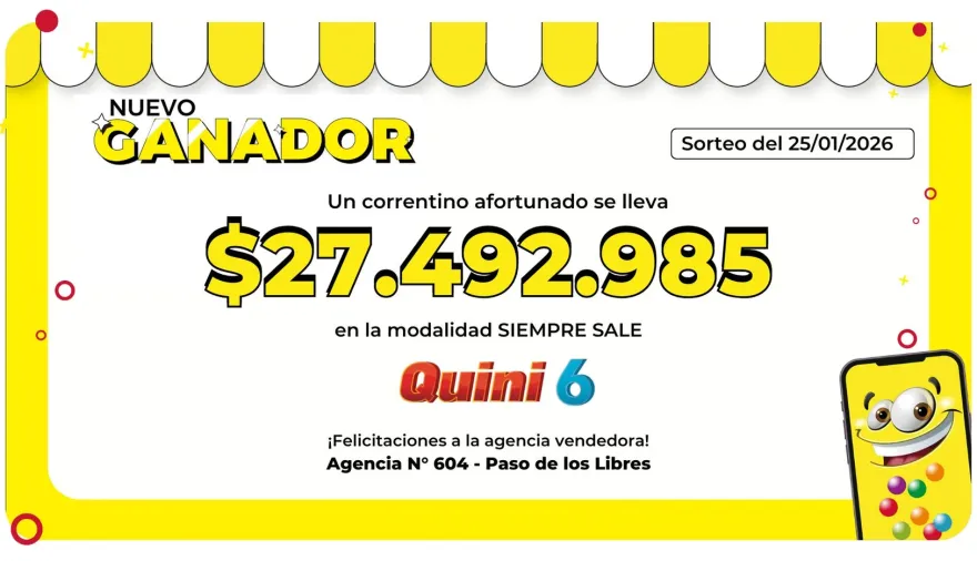 El sorteo de anoche del Quini 6 dejó un nuevo ganador en la provincia de Corrientes. Un apostador de la localidad de Paso de los Libres resultó favorecido en la modalidad Siempre Sale, llevándose un premio de $27.492.985.