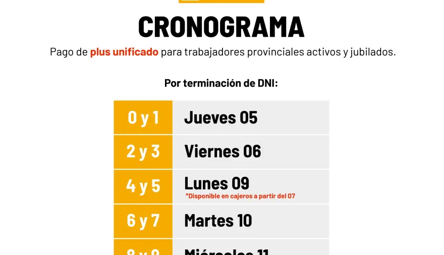 El pago del Plus del mes de marzo alcanza a los agentes de la administración pública provincial activos, jubilados y pensionados. El cronograma se ejecutará en cinco días, abonándose dos terminaciones de documento por jornada, a partir de este jueves 5.